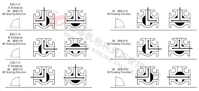 電動低溫三通球閥分L型和T型,介質流通方向見下圖。L型電動三通球閥適用于介質流向的切換,能使相互垂直的兩個通道連通:T型電動三通球閥適用于介質的分流、合流或流向 切換,T型孔道可以使三個通道互相連通或使其中兩個通道連通,電動三通球閥一般采用三個閥座結構,亦可根據用戶要求采用四閥座結構。